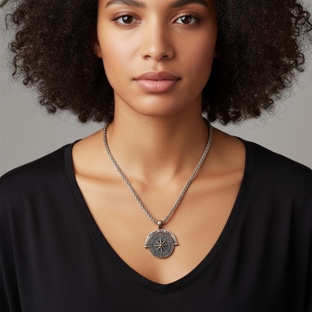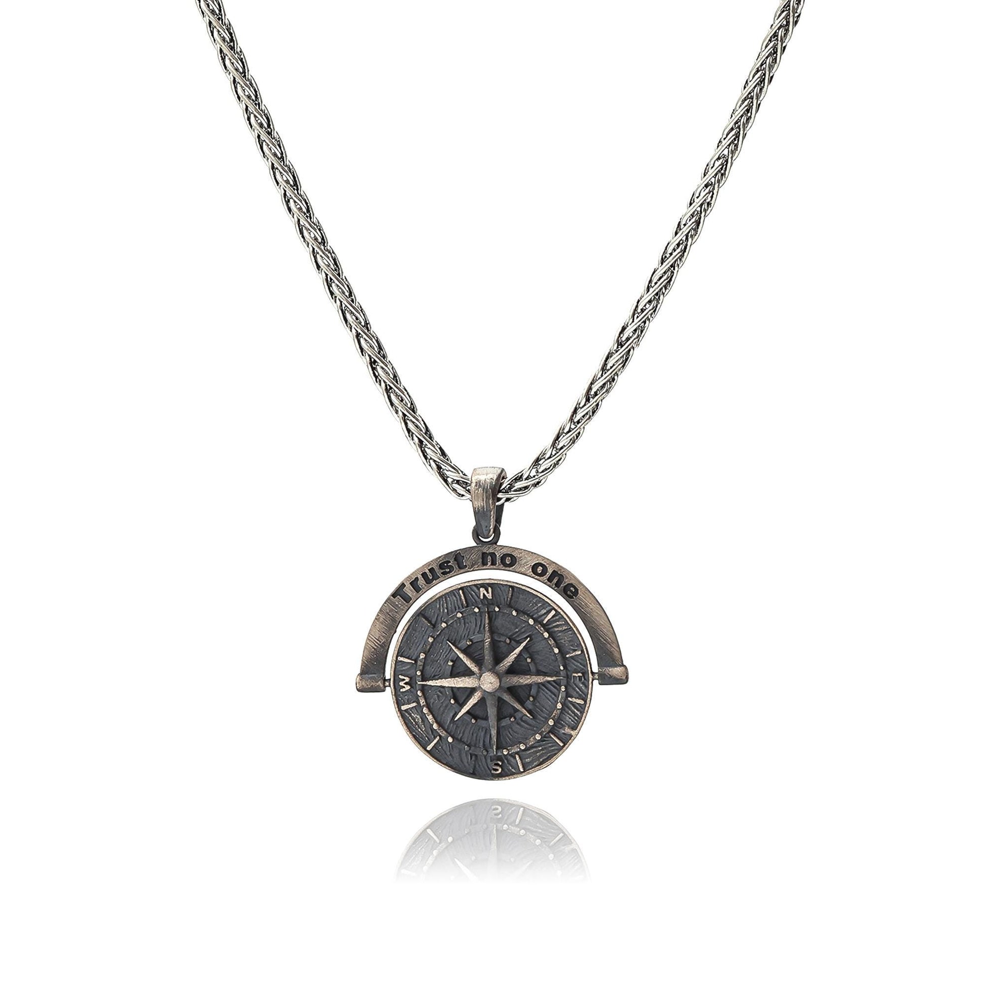 WHAT/WHY: Crafted from genuine 925 Sterling Silver, this piece features a sleek Compass Pendant, a classic symbol of guidance and protection. Its unique, optional message ("Trust No One") adds a layer of mystery and strength, embodying self-reliance.