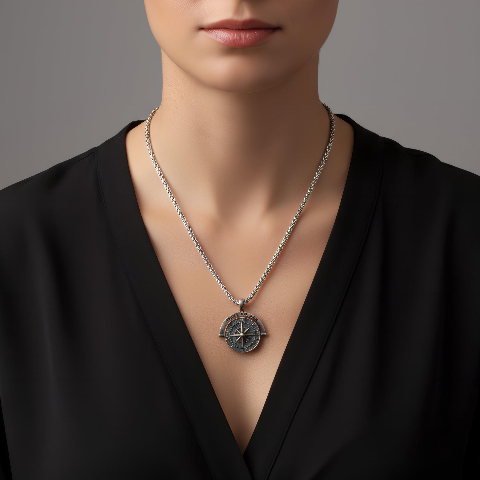 WHAT/WHY: Crafted from genuine 925 Sterling Silver, this piece features a sleek Compass Pendant, a classic symbol of guidance and protection. Its unique, optional message ("Trust No One") adds a layer of mystery and strength, embodying self-reliance.